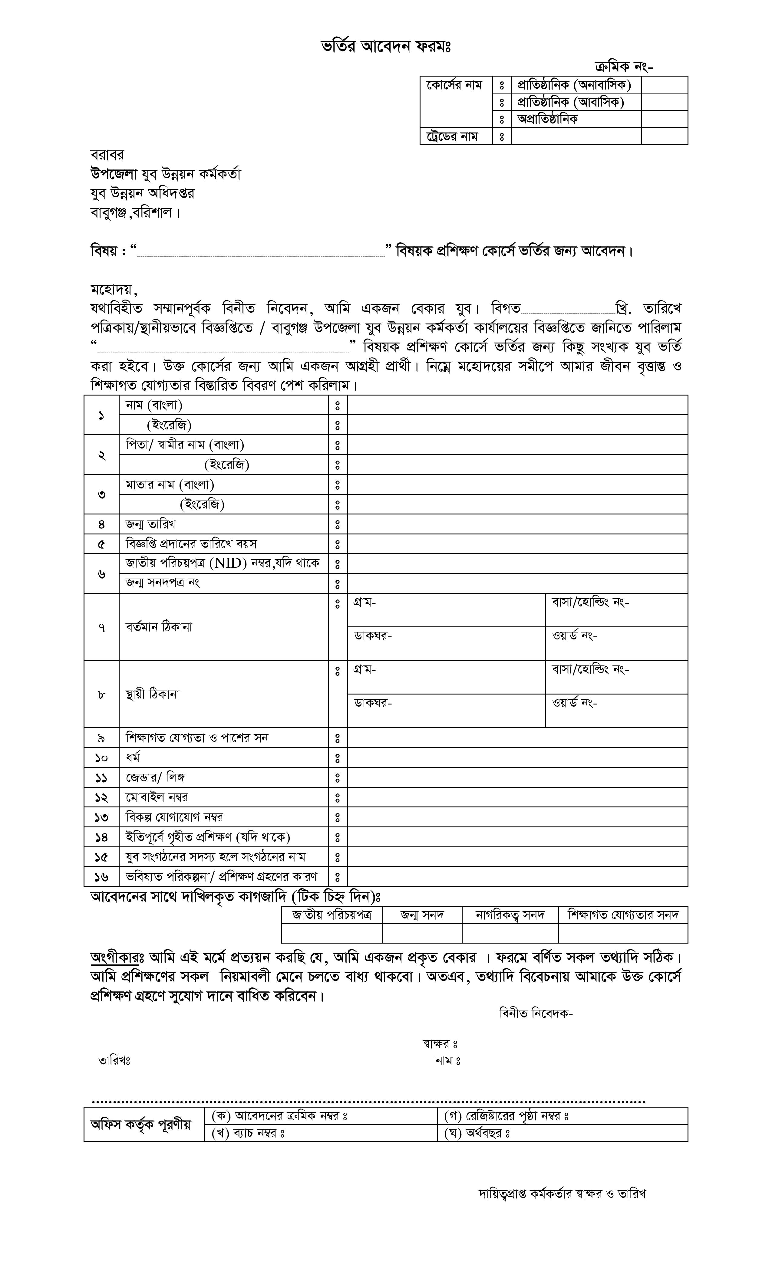 ভর্তির আবেদন ফরম (উপজেলা পর্যায়ে)